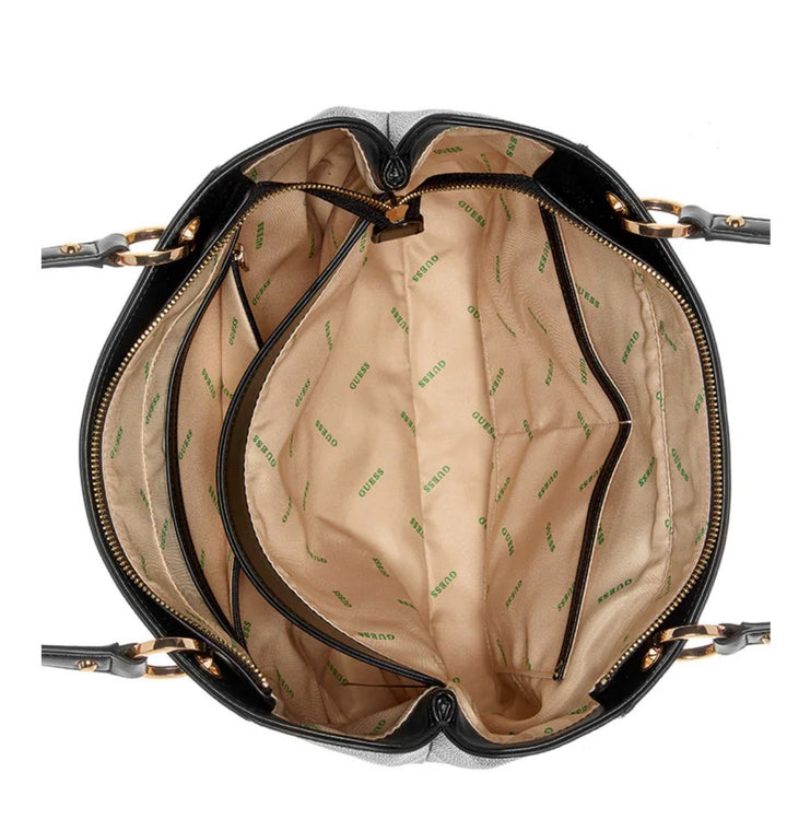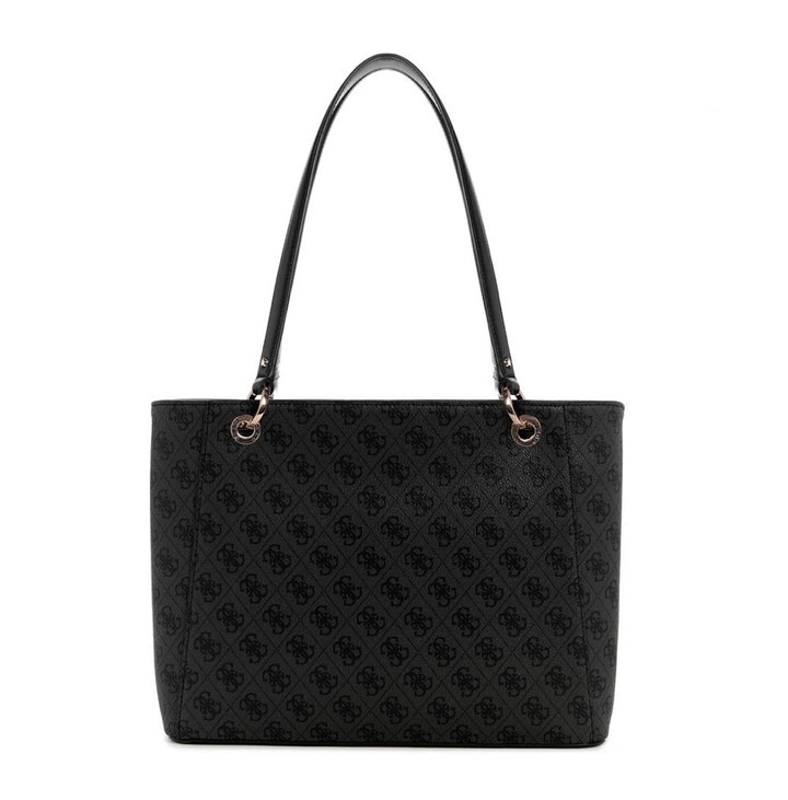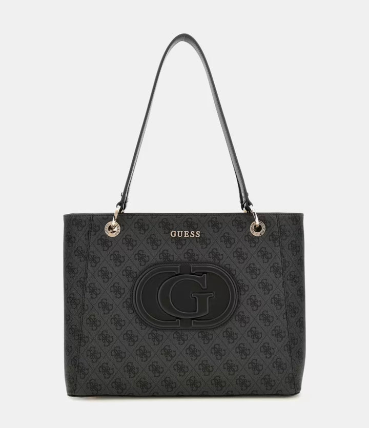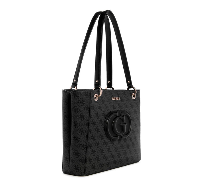 Featuring a secure zip closure, the Guess Eco Mietta Noel Tote handbag showcases fashion and practicality. The standout design is completed with a maxi G logo on the front and sleek metal logo lettering on the back, offering both elegance and functionality.